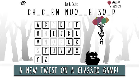 Your goal is to guess the word or phrase to save the player from the hungry monster. Guess one letter at a time to see if it’s in the Hangman word. Tap on a letter to guess it and the letter will fill in a blank space if you guess a letter correctly. If not, you’ll pop a balloon and get closer to falling in the beast’s mouth! Try to guess the word or phrase once you have enough correct letters on the Hangman board.