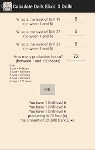 Calculate the production of Gold, Elixir and Dark Elixir depending on the time: where you can calculate the production of Gold, Elixir and Dark Elixir depending on the chosen time, for example: A level 9 Gold Mine produces as Gold in 24 hours? The answer you can find in the application.