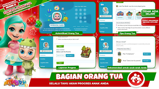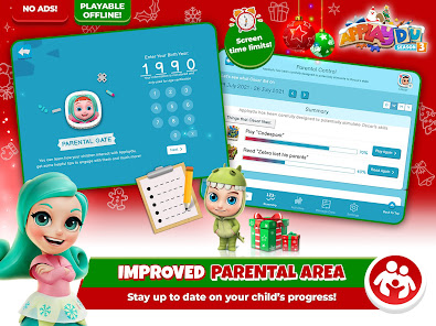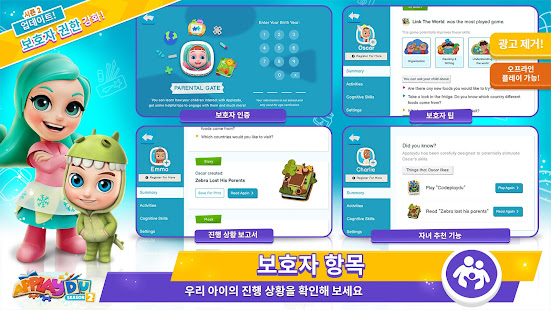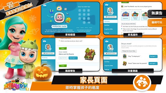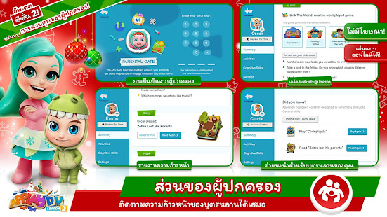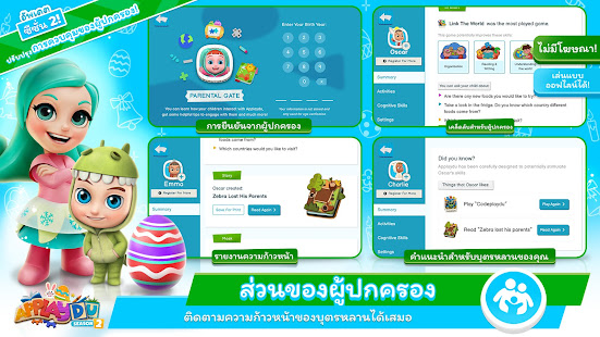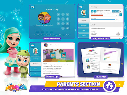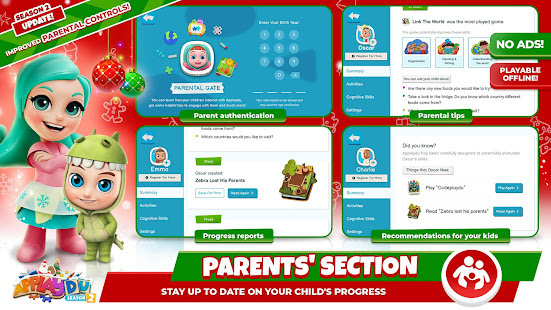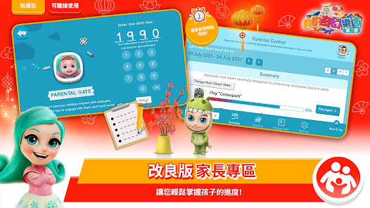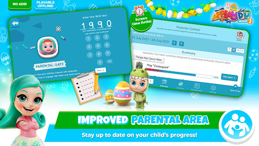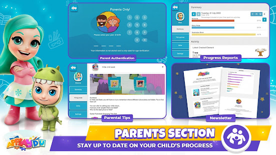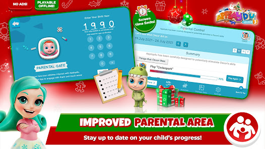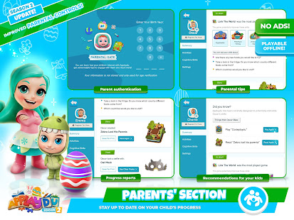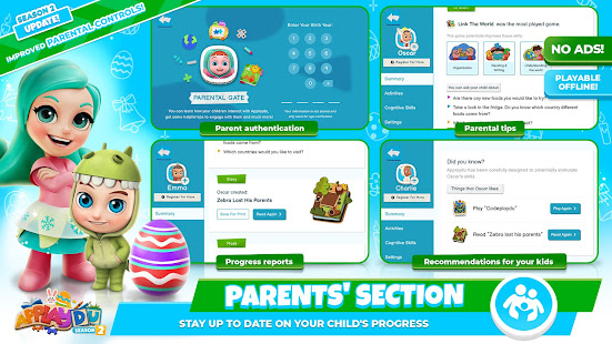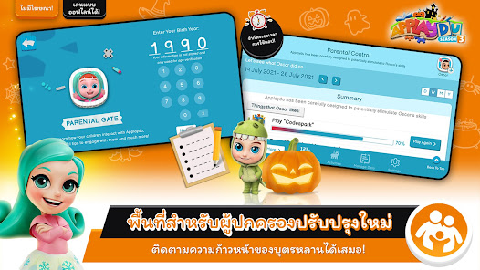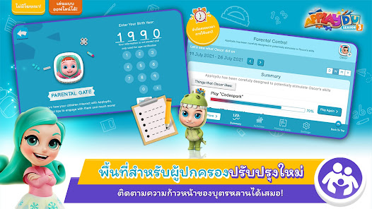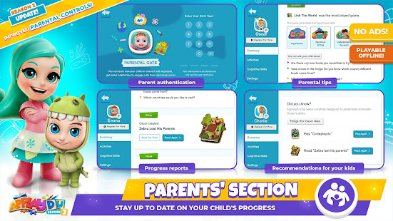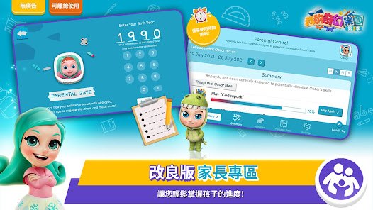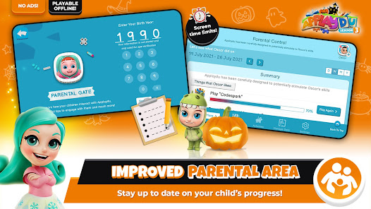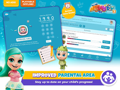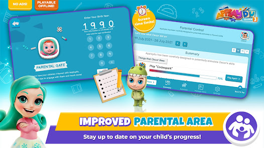 Giám sát trải nghiệm của con bạn thông qua phần dành riêng cho phụ huynh để theo dõi tiến trình của chúng. Tạo nhiều hồ sơ cho con bạn và nhận các hoạt động được đề xuất cho từng hồ sơ thông qua các báo cáo tiến độ. Với Phần 3, bạn thậm chí có thể theo dõi thời gian chơi của con mình bằng cách đặt giới hạn thời gian sử dụng thiết bị.