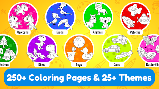 Coloring Book for Preschool and Kindergarten Kids is free to download educational game designed for children of age group 2 to 8 years. It contains 25+ different themes with more than 250+ coloring pages.