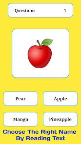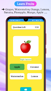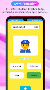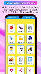 Với ứng dụng này, những đứa trẻ đang đi học mẫu giáo của bạn học cách xác định-Trái cây, Rau, Động vật, Chim, Bộ phận cơ thể, Quần áo, Nghề nghiệp / Nghề nghiệp, Thể thao, Xe cộ, Địa điểm, Thời gian và Con số