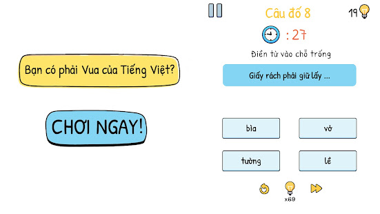 Hành trình để trở thành Vua Tiếng Việt chưa bao giờ là dễ dàng, hãy cố gắng để vượt qua tất cả các cấp độ và chứng minh bạn thông thạo ngôn ngữ Việt Nam. Vua Tiếng Việt được coi là game luyện trí não, thử thách IQ hài hước nhất trong lịch sử đợi bạn thách thức.
