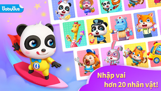 Trong Trò Chơi Trong Nhà Bé Gấu Trúc, các bé có thể vui chơi với hơn 20 nghề nghiệp như bác sĩ, cảnh sát, nghệ sĩ trang điểm, lính cứu hỏa và thợ làm bánh! Mỗi nghề nghiệp có các nhiệm vụ và thử thách riêng, cho phép các bé học hỏi, khám phá và tạo ra câu chuyện của riêng mình trong khi tìm hiểu về sự đa dạng của thế giới thông qua việc nhập vai