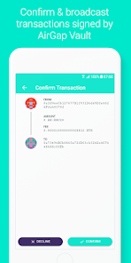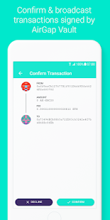 Ví AirGap bắt đầu giao dịch, kết nối với mạng để tìm nạp dữ liệu từ chuỗi khối và hiển thị thông tin này trong ứng dụng dưới dạng tổng quan về danh mục đầu tư. Tuy nhiên, Vault không kết nối với bất kỳ mạng nào, bất kể thiết bị được sử dụng. Vault ký các giao dịch và bảo vệ khóa cá nhân của bạn một cách an toàn khi ngoại tuyến.