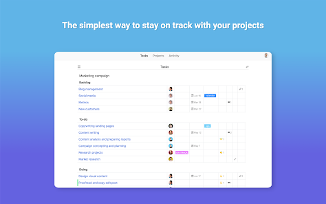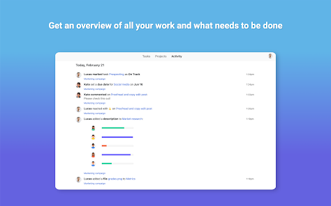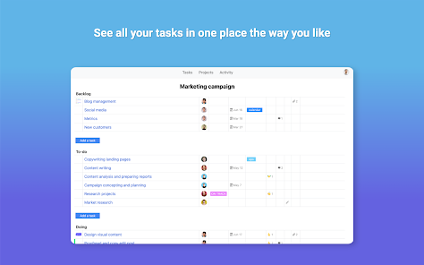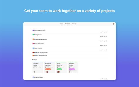 Chia nhỏ công việc của nhóm thành các nhiệm vụ có thể quản lý và giao cho mỗi người một chủ sở hữu rõ ràng. Xem tất cả công việc của bạn trong danh sách nhiệm vụ, bảng dự án hoặc lịch.